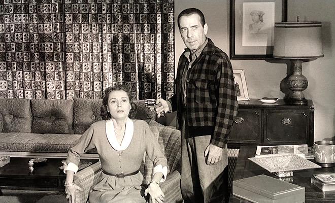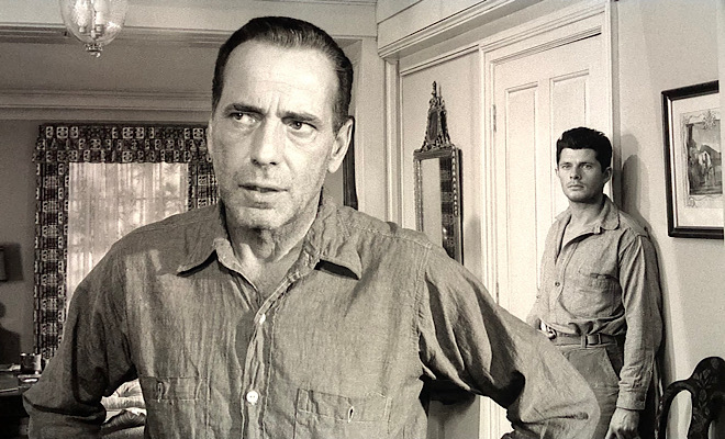 Filmed in VistaVision, the enhanced definition widescreen process that Paramount pioneered in the 1950s and reserved for its flagship productions, “The Desperate Hours” jumps off the screen, even in black-and-white. The wow factor is in full force from the moment the opening credits begin to roll and it never wanes over the course of the film’s almost two-hour running time. The 1080p/AVC MPEG-4 transfer flaunts an alluring dimensional quality that enhances depth, heightens the sheen of auto paint, and helps costume patterns and fabrics pop. A natural yet faint grain structure maintains the film-like feel and preserves the integrity of the cinematography of Lee Garmes, who won an Oscar almost 25 years earlier for 1932’s Shanghai Express. Terrific clarity and contrast, inky blacks, crisp whites, and beautifully varied grays produce a dazzling, well-balanced picture, though isolated instances of softness occasionally crop up. Excellent shadow delineation keeps crush at bay, reflections in mirrors and glass are well defined, and razor-sharp close-ups showcase all the careworn wrinkles and crow’s feet on March’s face, as well as Bogart’s omnipresent stubble, baggy eyes, and unkempt appearance.
